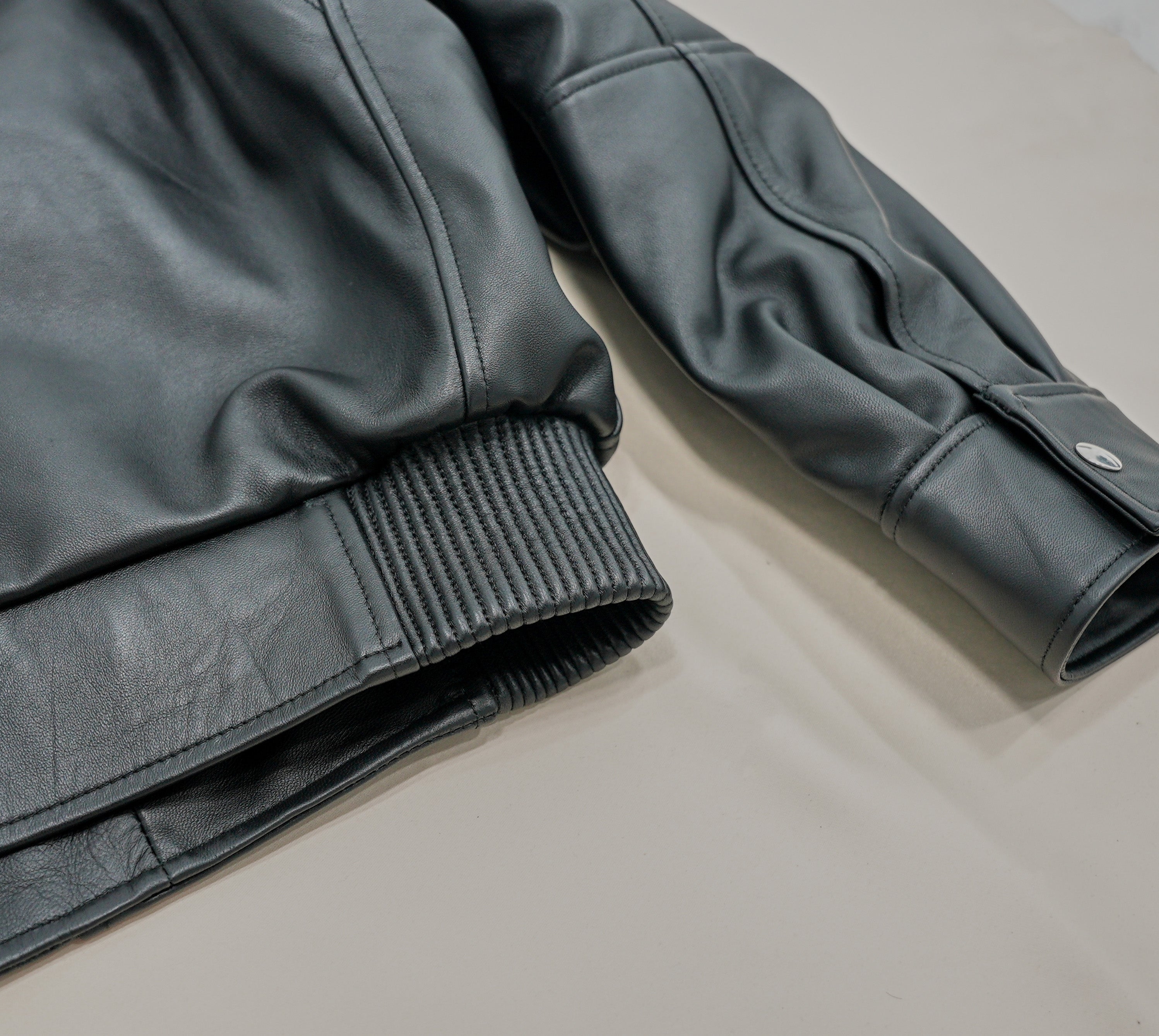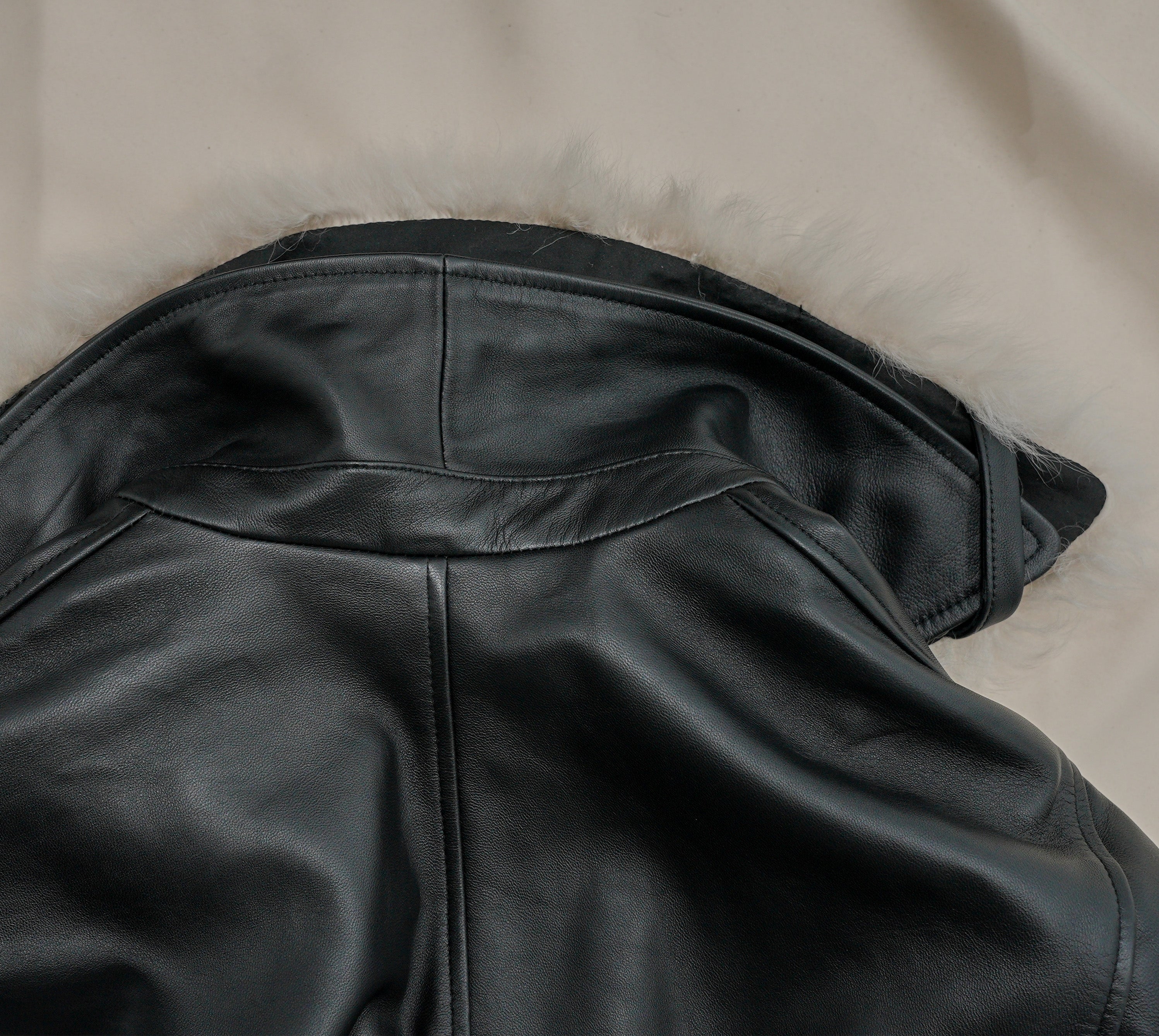 BLACK COWHIDE LEATHER FROM SPAIN. COTTON TWILL LINING. SPREAD COLLAR WITH HIMALAYAN GOAT FUR THAT CAN BE REMOVED AT WILL. MADE IN ISTANBUL.